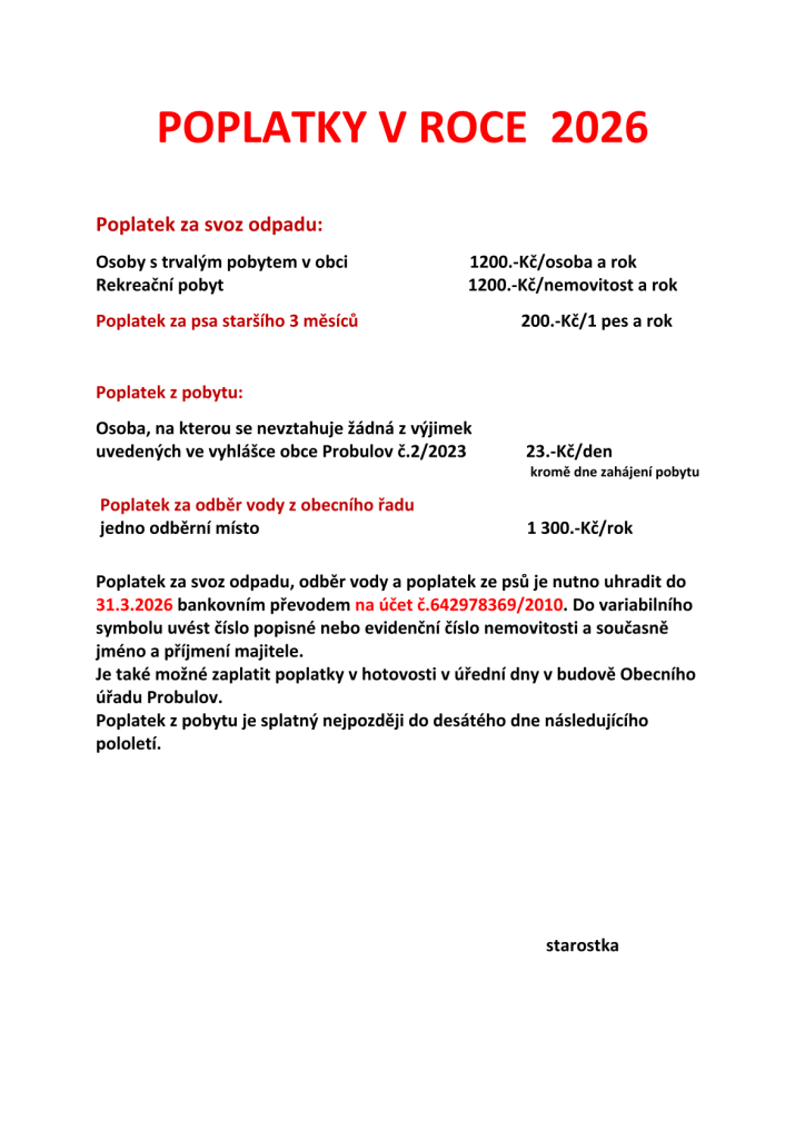 Poplatek za svoz odpadu, odběr vody a poplatek ze psů je nutno uhradit do 31.03.2026 bankovním převodem na účet č.642978369/2010.
