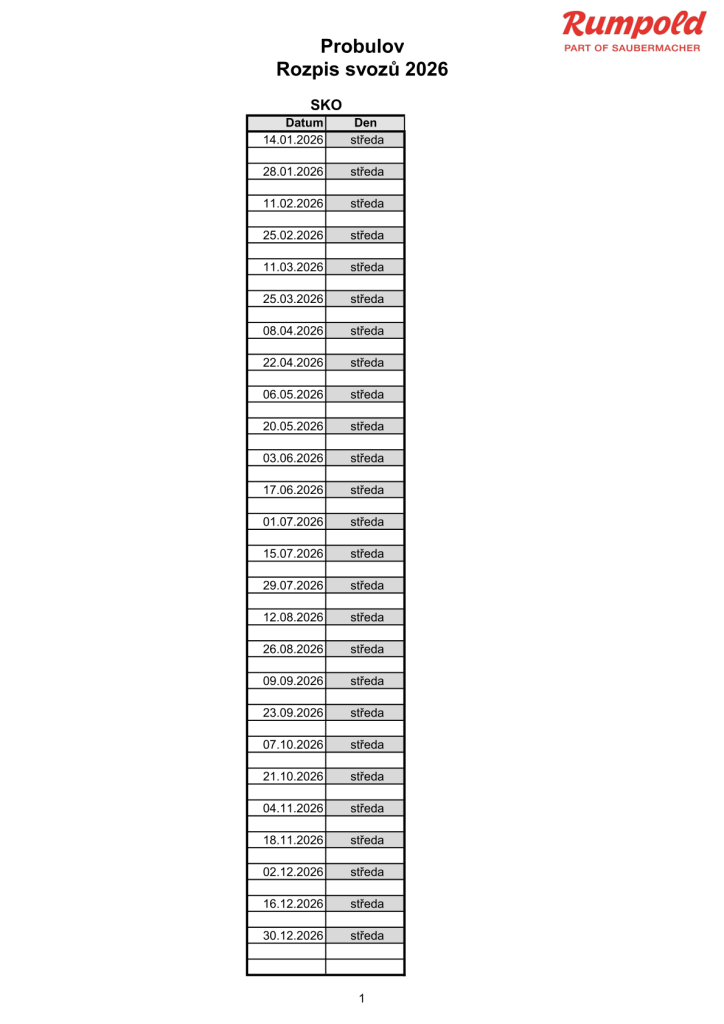 Svoz směsného komunálního odpadu pro rok 2026 je 1x za 14 dní., každou středu.